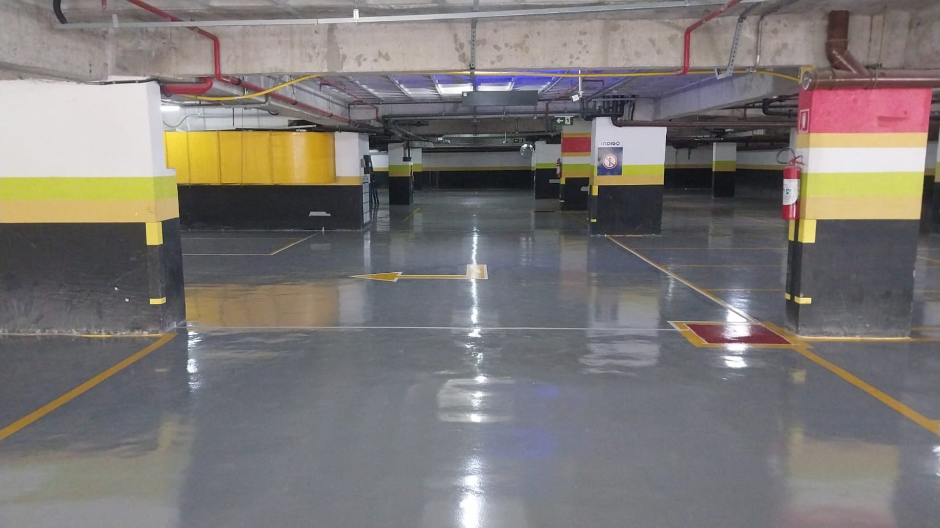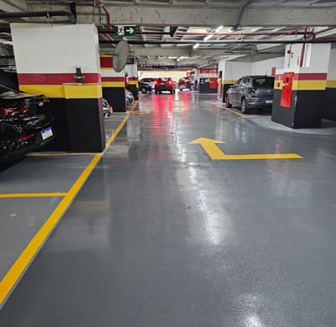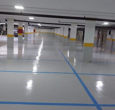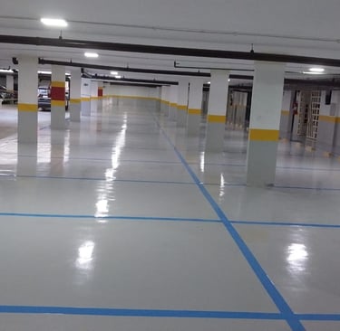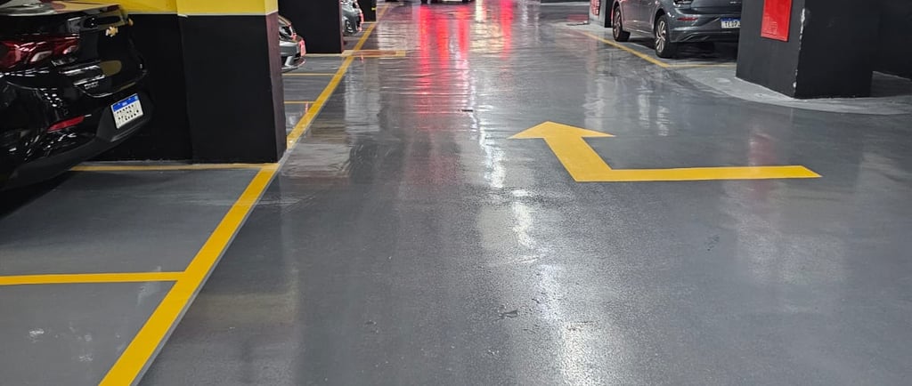 A pintura epóxi é um sistema aplicado sobre o piso previamente preparado, formando uma camada de proteção com ótima aderência e acabamento. Pode ser utilizada tanto na pintura total quanto em demarcações como vagas, setas e áreas de circulação.